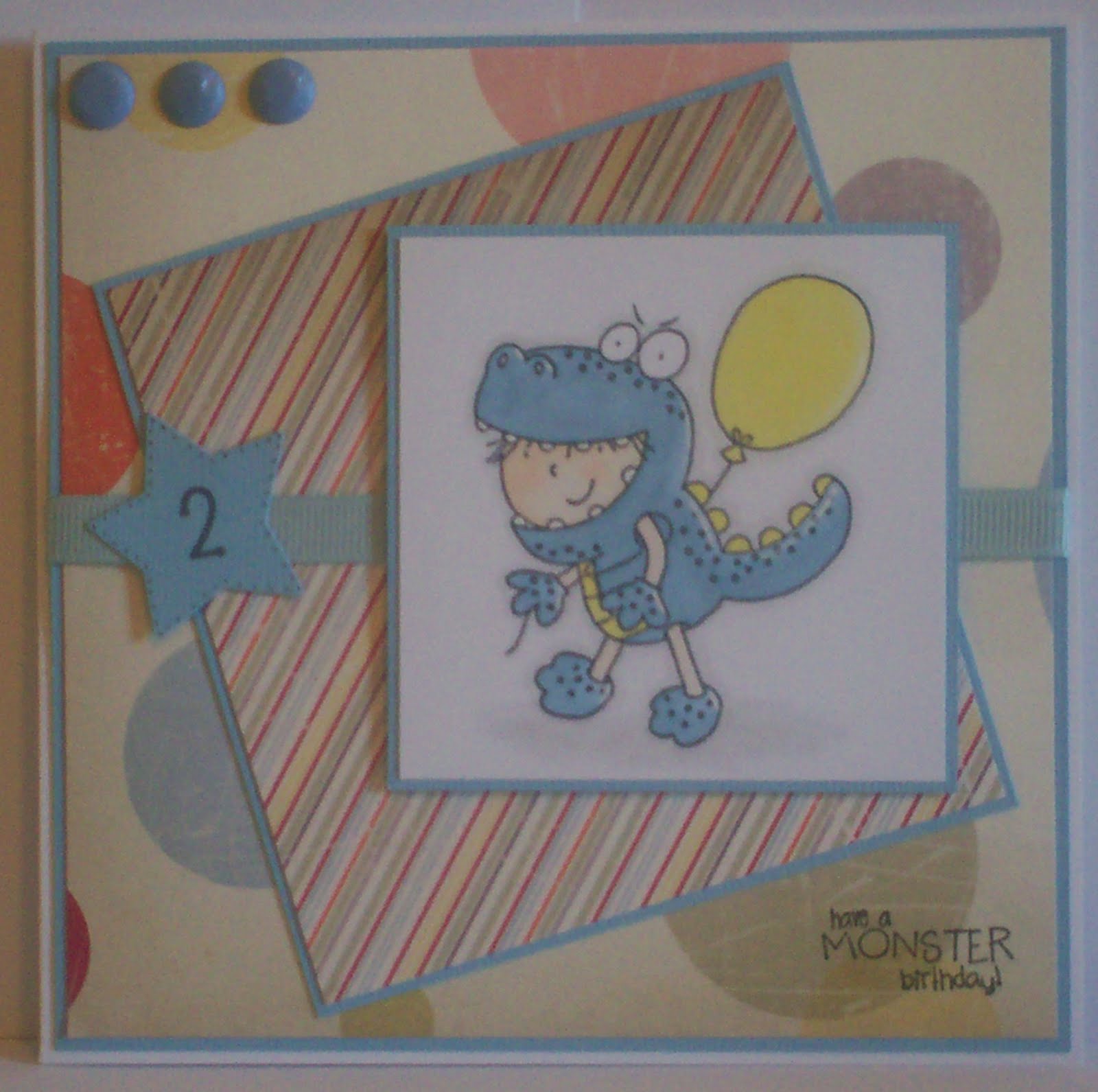 I've used the lovely sketch at Friday Sketchers, I really like this one and I'm sure I'll use it again. The stamp is from Squiggle Stamps, so cute isn't it? It came with the little sentiment too. First time I've used this stamp and I really like it. I've coloured the image with promarkers and I've used a white highlighter pen on the teeth (and for the little highlights obviously). The papers are Cosmo Cricket, cardstock is coredinations. Added some ribbon from stash, card candy dots and a star cut with a sizzix die - printed the 2 from the computer and added some little dots around the star with a black fineliner.